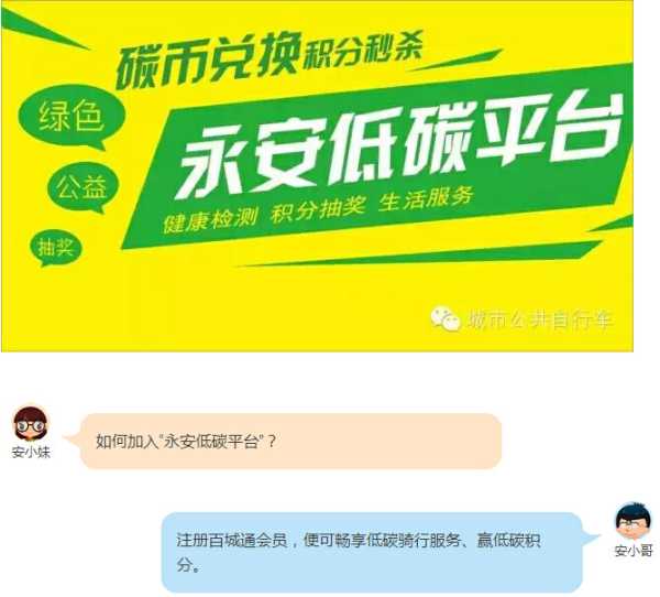 因?yàn)槟鷮?duì)低碳環(huán)保事業(yè)的貢獻(xiàn),我們?yōu)槌晒ψ?cè) “ 永安百城通會(huì)員 ”的每次有效騎行計(jì)算碳積分,而碳積分會(huì)自動(dòng)轉(zhuǎn)換為“ 碳幣”存入您的低碳銀行賬戶。 “百城通”會(huì)員的碳幣,即將實(shí)現(xiàn)在永安低碳平臺(tái)上進(jìn)行碳幣交易,兌換相應(yīng)的商品,同時(shí)也可進(jìn)行“ 碳公益”、“ 積分秒殺”“ 積分抽獎(jiǎng)”等一系列的優(yōu)惠活動(dòng)。 快快告訴您的好友及家人,“永安低碳平臺(tái)”保存了你們的歷史騎行碳積分,趕快來(lái)把它們轉(zhuǎn)換為“碳幣”吧!(溫馨小提示:3個(gè)月后我們將不再進(jìn)行歷史碳積分的轉(zhuǎn)換服務(wù)了哦~)。 “永安低碳平臺(tái)”,讓你成為”低碳達(dá)人”,帶您體驗(yàn)精彩人生! |