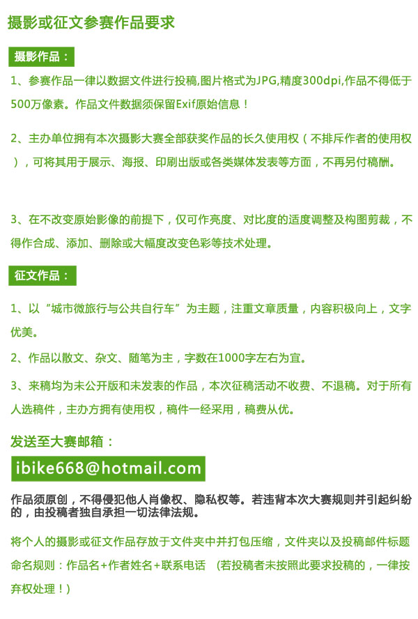 文采飛揚(yáng)的你;愛(ài)街拍的你;愛(ài)騎行的你;愛(ài)旅游的你;我們找的就是你!豐富獎(jiǎng)品等你來(lái)拿!即日起至2014年12月12日,【城市微旅行之尋找最美公共自行車站點(diǎn)】攝影和征文大賽作品征集中。