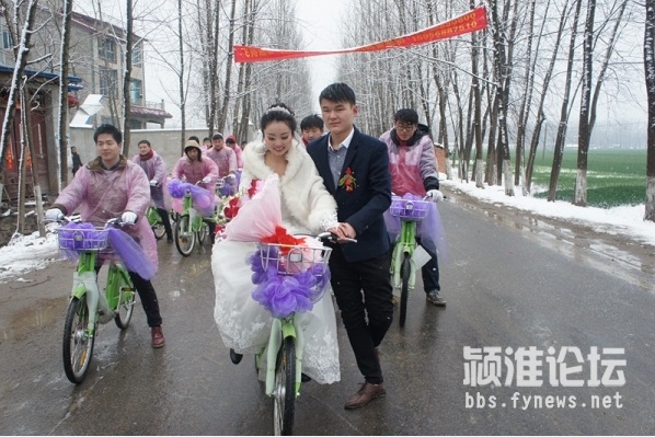 時云濤是一名年輕的90后,在阜陽臨沂商城從事門業(yè)生意。新娘名叫閆瑞金,是行流鎮(zhèn)高橋村人,新娘和新郎是高中同學(xué),兩人戀愛至今已經(jīng)走過了四五個年頭,大學(xué)期間兩人分隔兩地,新郎時云濤在大一時退學(xué)回家創(chuàng)業(yè),自主創(chuàng)業(yè)生意也是越來越紅火,事業(yè)有成接下來就要抱得美人歸了,結(jié)婚無疑是一件人生大事,這結(jié)婚就是要結(jié)的與眾不同,什么樣的結(jié)婚形式才能更別出心裁呢,時云濤在采辦結(jié)婚用品的時候,碰巧看見了停放在臨沂商城附近的公共自行車,時云濤就想如果用公共自行車當(dāng)婚車,不僅節(jié)能環(huán)保,而且整齊劃一,想想那齊刷刷排整齊的自行車迎親隊伍,效果應(yīng)該是不一般的吸引眼球吧,于是這個創(chuàng)意婚禮的念頭就這樣應(yīng)運而生。